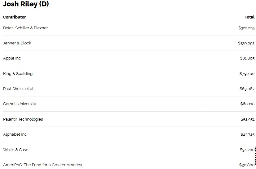 Josh has also represented some of the other big corporations you can see listed here such as Apple, as well as Google’s parent company Alphabet. Now, putting aside conversations about the military-industrial complex, ICE, and coziness with Big Tech, does this sound like someone who is free of the “corrupting influence of money in politics”? Does this sound like someone who is always “fighting for the underdog”? Are the millionaires in Washington D.C. and Silicon Valley who contributed to the Riley campaign doing so because they’re so passionate about fighting the “corrupting influence of money in politics”? Especially considering it’s their own money in question? Or are they expecting to get something in return? Are they investing in someone that they know has their interests at heart because he has time and again represented them?
